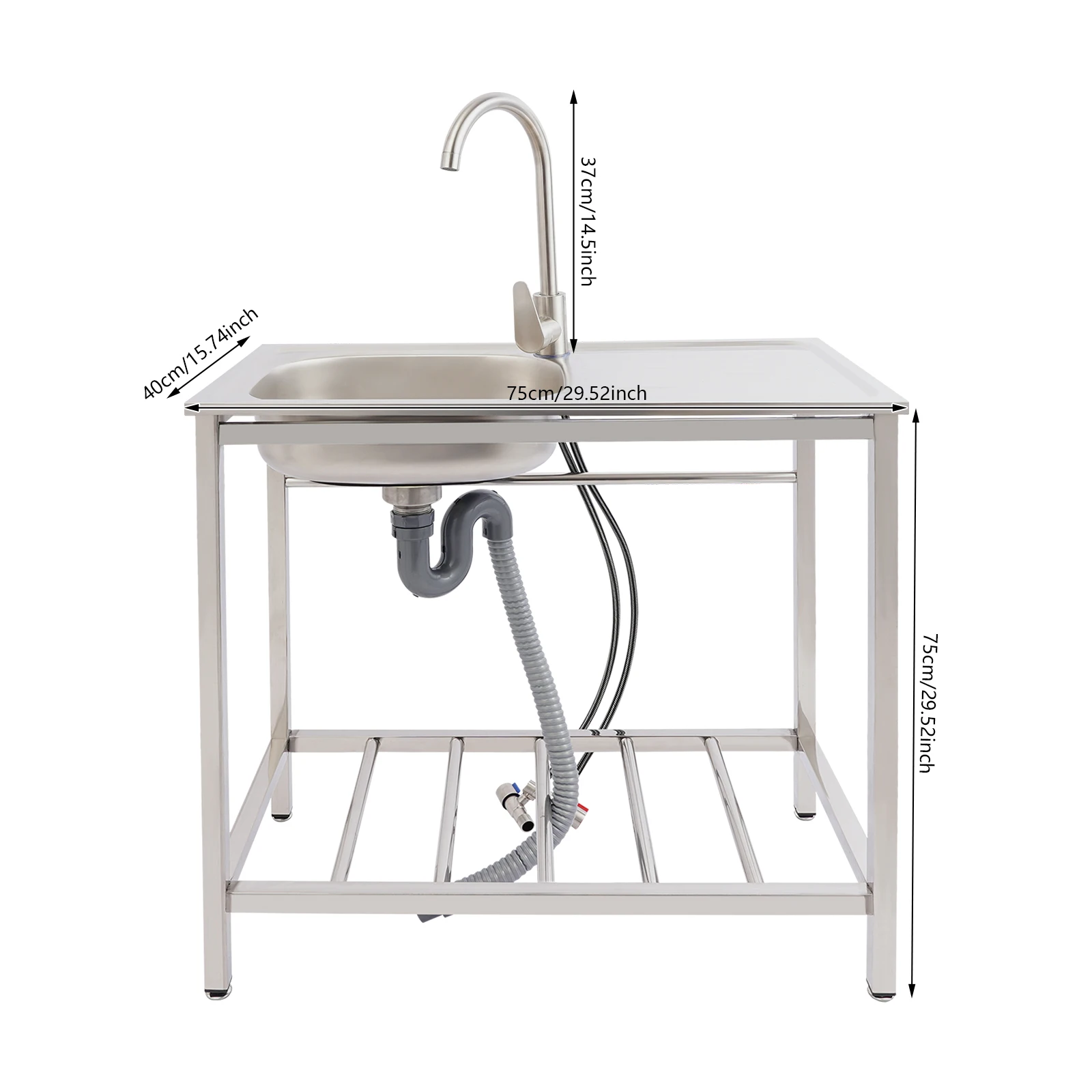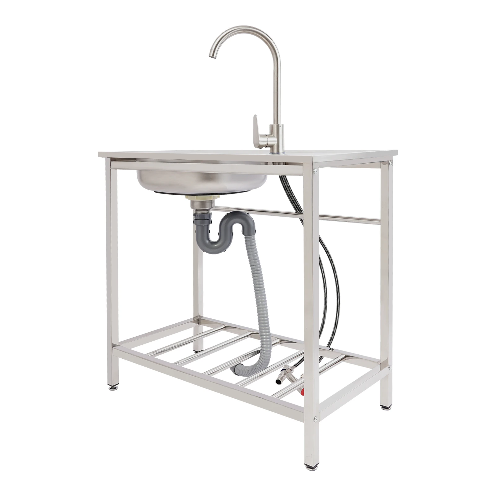201 Stainless Steel Freestanding Sink with Faucet Hot Cold Water Large Basin 88lbs Capacity Bottom Shelf for Kitchen Garage