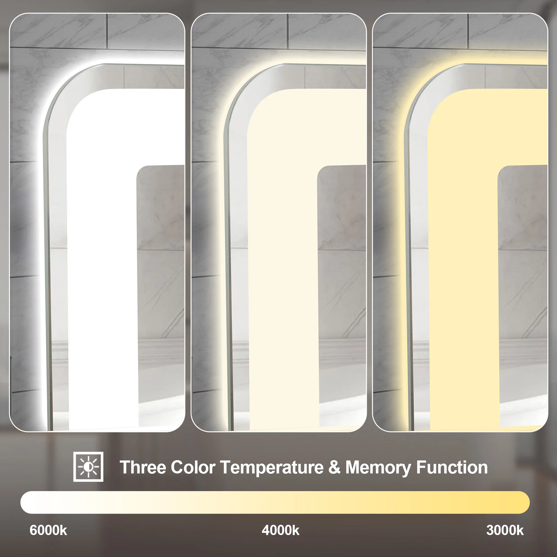 • Full Lighting Control: Dimmable + 3 Color Temperatures:Take charge of your light. Choose from three precise color temperatures—white light (6000K), neutral light (4000K), and warm light (3000K)—and seamlessly adjust brightness from 0% to 100% with smooth, continuous dimming. Whether you’re applying makeup, shaving, or setting a relaxing mood, you’ll always have the perfect light.