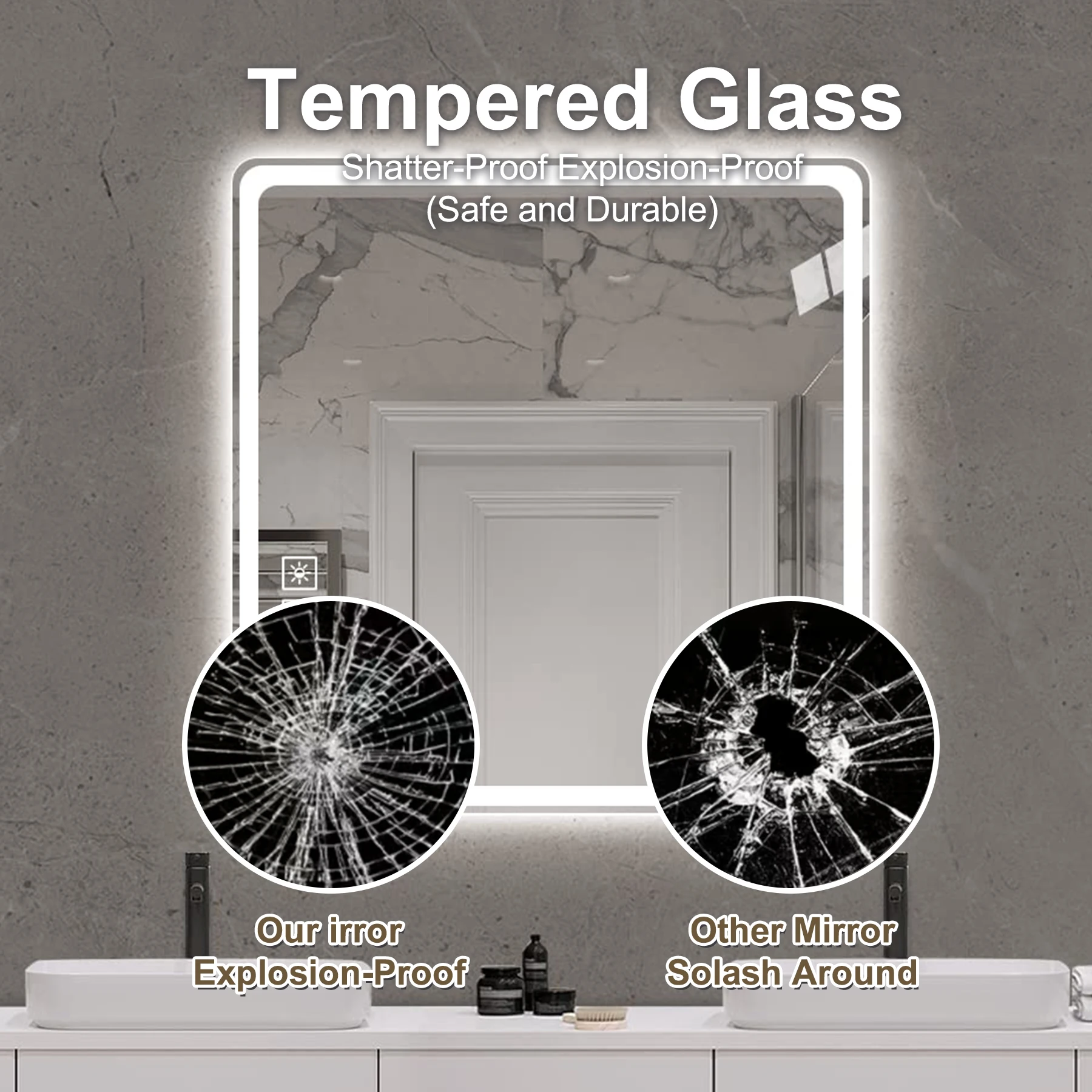 • Safety-First Explosion-Proof Design:Your family’s safety is our priority. The mirror is backed with a full shatter-resistant film. In the unlikely event of impact, the glass is designed to hold together, preventing dangerous sharp shards from scattering. A reliable, secure choice for any household.