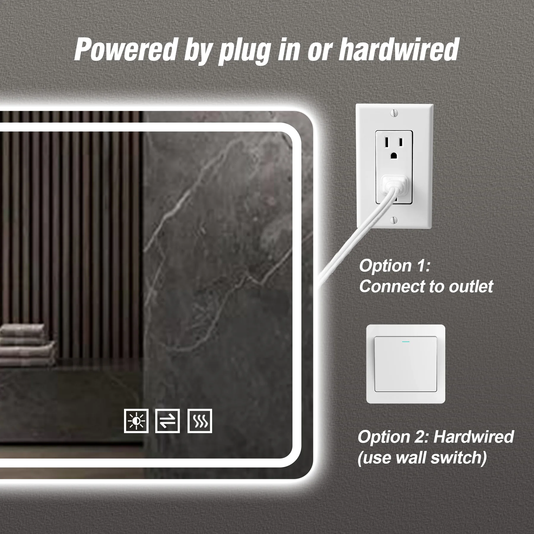• Two Power Supply Options:Option 1 : Hardwired InstallationPre-wire your wall, then connect the mirror by removing its plug and securing the wires directly.Option 2 : Plug-in InstallationUse the included plug with a nearby outlet. Please ensure the outlet is located beside, not behind, the mirror for easy access and safety.