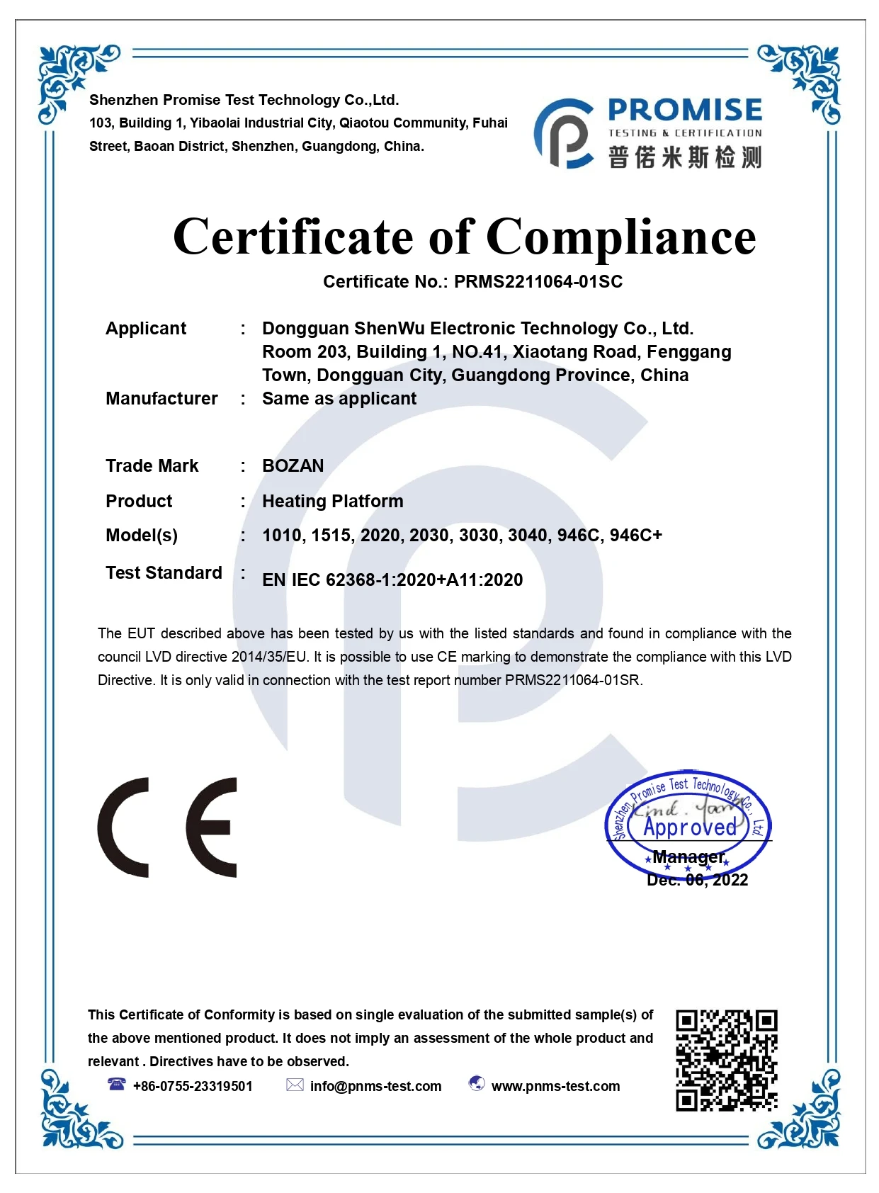 • Certification: CE
