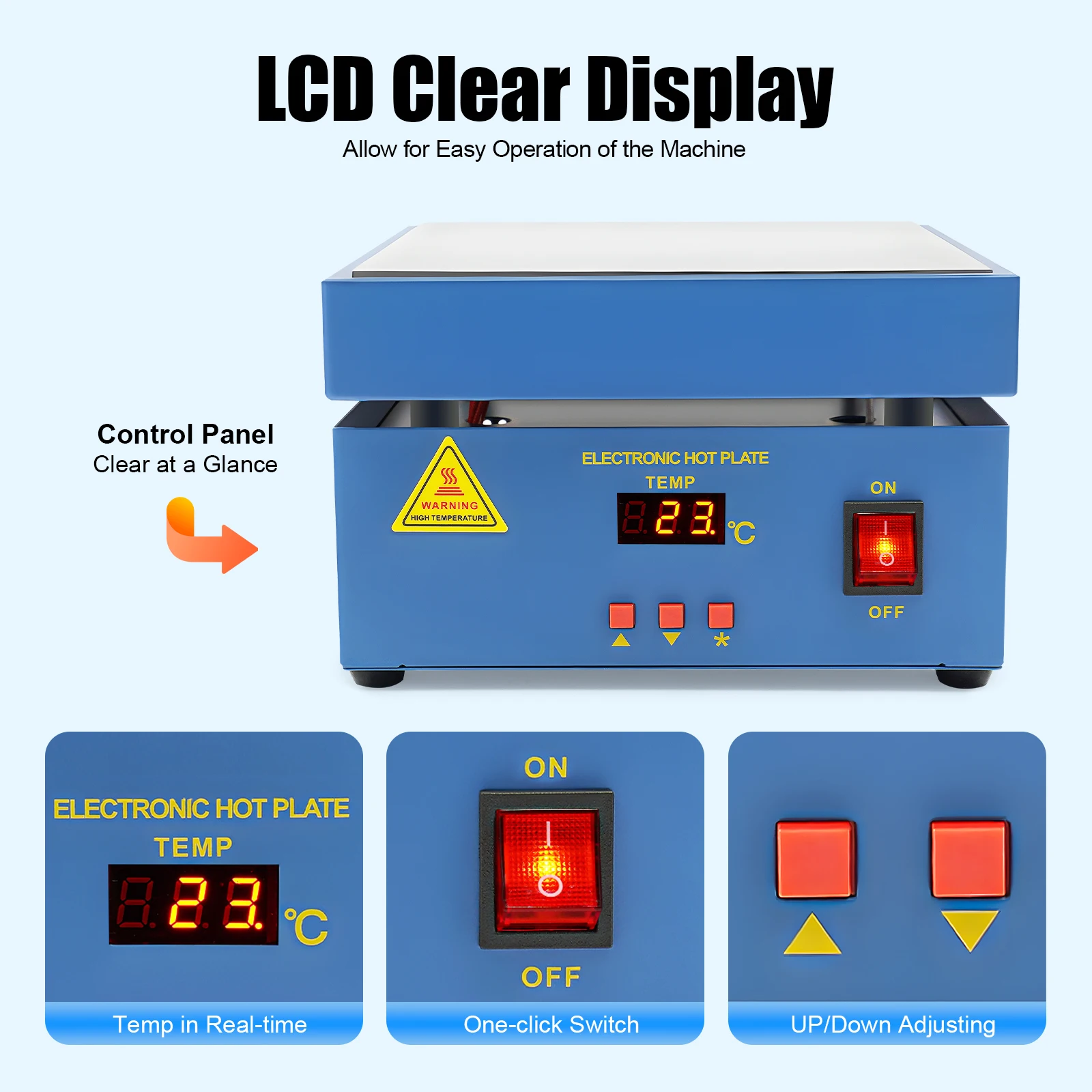 Simple Operation: A clear control panel makes the functions clear at a glance, the LCD shows the temperature in real-time, and the one-click switch allows you to easily operate the machine.
