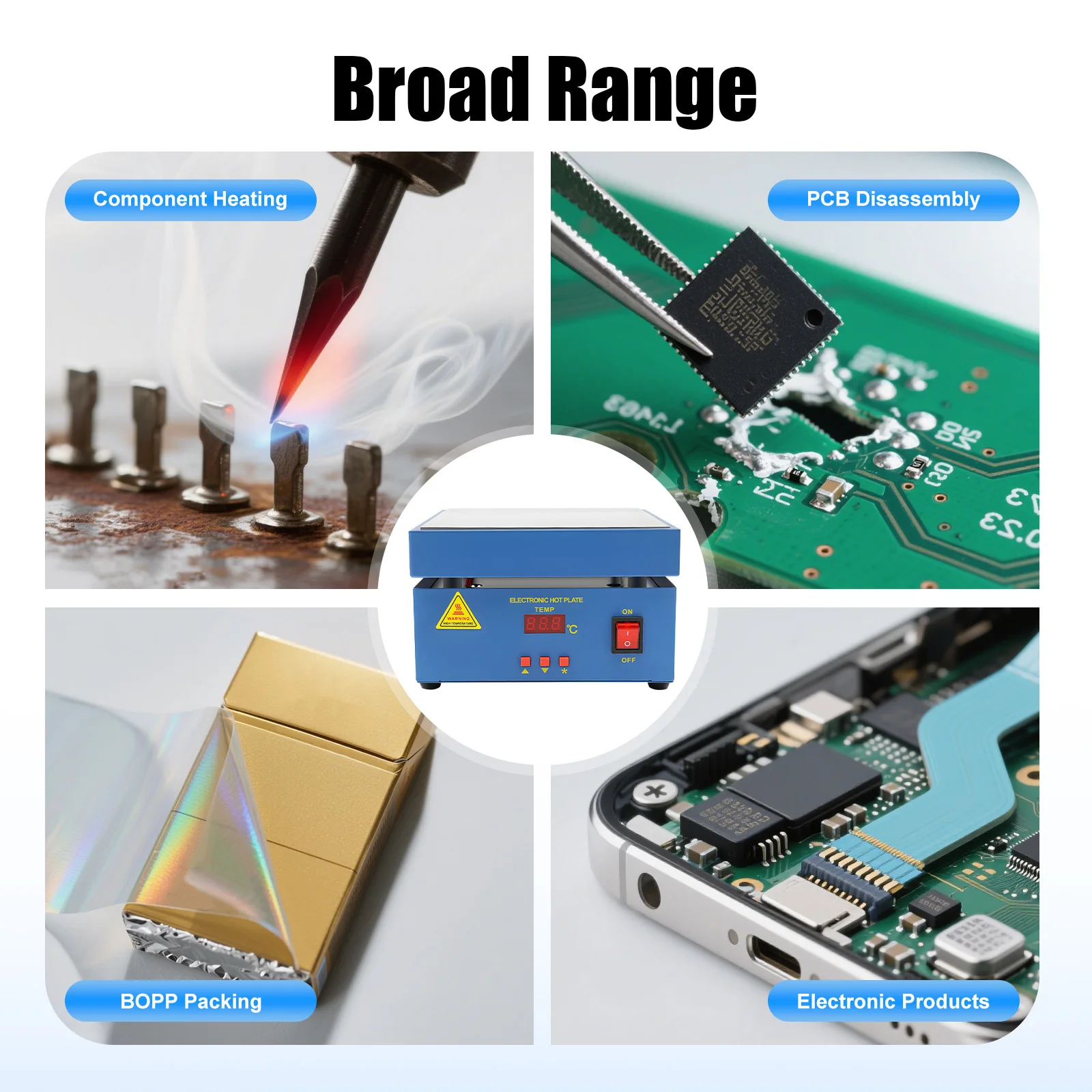 It is widely used in research institutes such as biology, electronics, and medicine, as well as in component heating operations, SMD reconstruction operations, PCB disassembly, and soldering operations. It is also used for cigarettes, poker boxes, cosmetics, perfume, electronic products, and other small sealed film packaging. It is suitable for films such as BOPP films and PVC heat-sealing films.