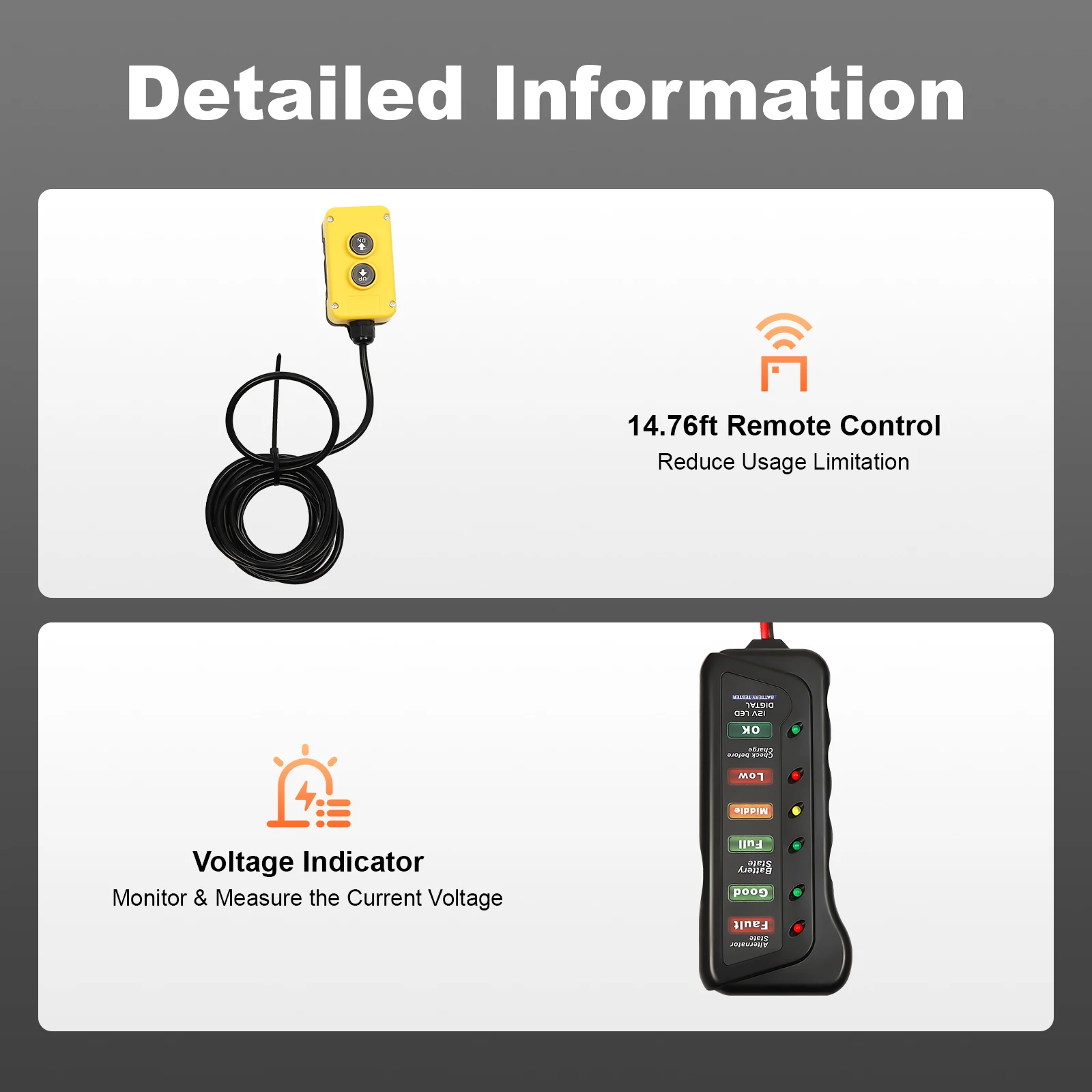●Remote Control: It includes a remote control system with a 14.76ft cord length, making it easy for you to lift and lower it remotely.