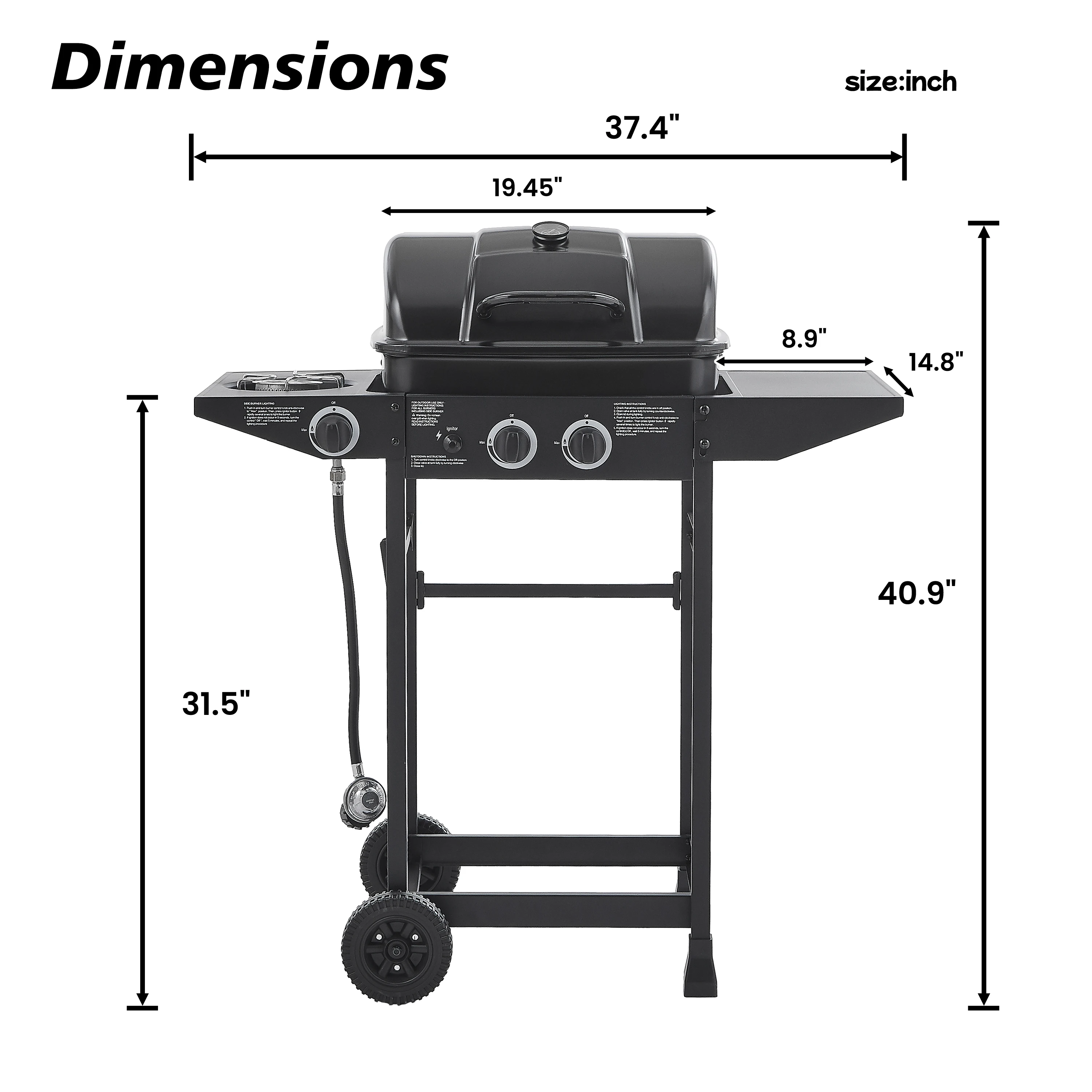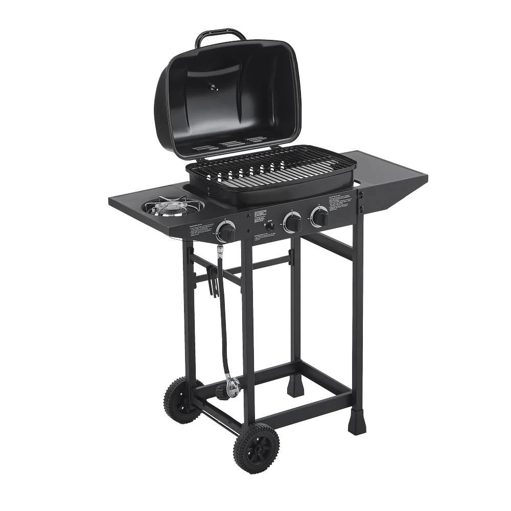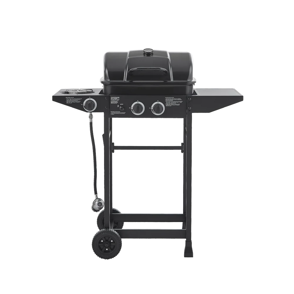 • This outdoor gas grill features 2 main burners and 1 side burner, delivering a total of 24000 BTU; Perfect for searing steaks and cooking with pots and pans, quick start up with the push &turn of a control knob.