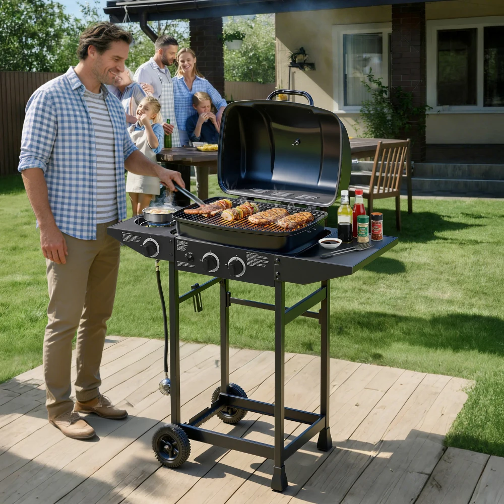 • Convenient Side Burner & Prep Shelf – A sturdy 8.9″ x 14.8″ side burner (supports 10–20 kg) lets you simmer sauces or sauté sides while grilling. Plus, the side shelf provides extra prep space for utensils, seasonings, and platters.