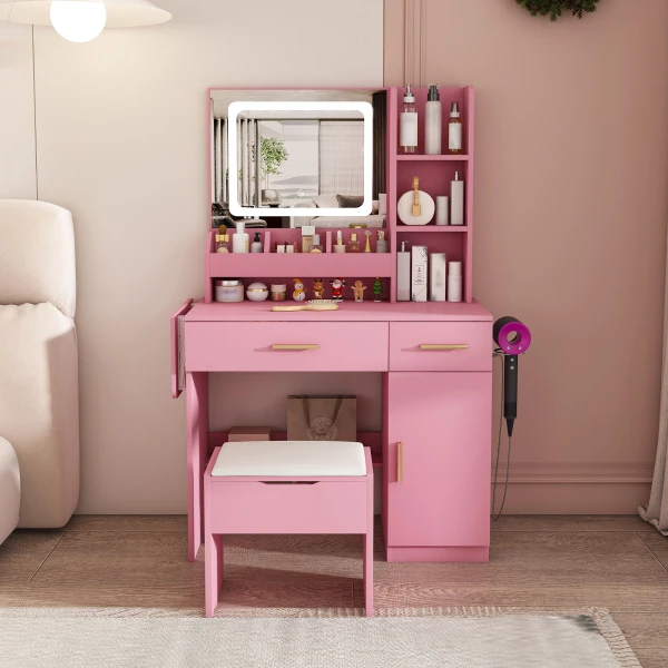 Vanity Desk with LED Mirror Lights and Power Outlet Charging Station, Makeup Dressing Table with 3